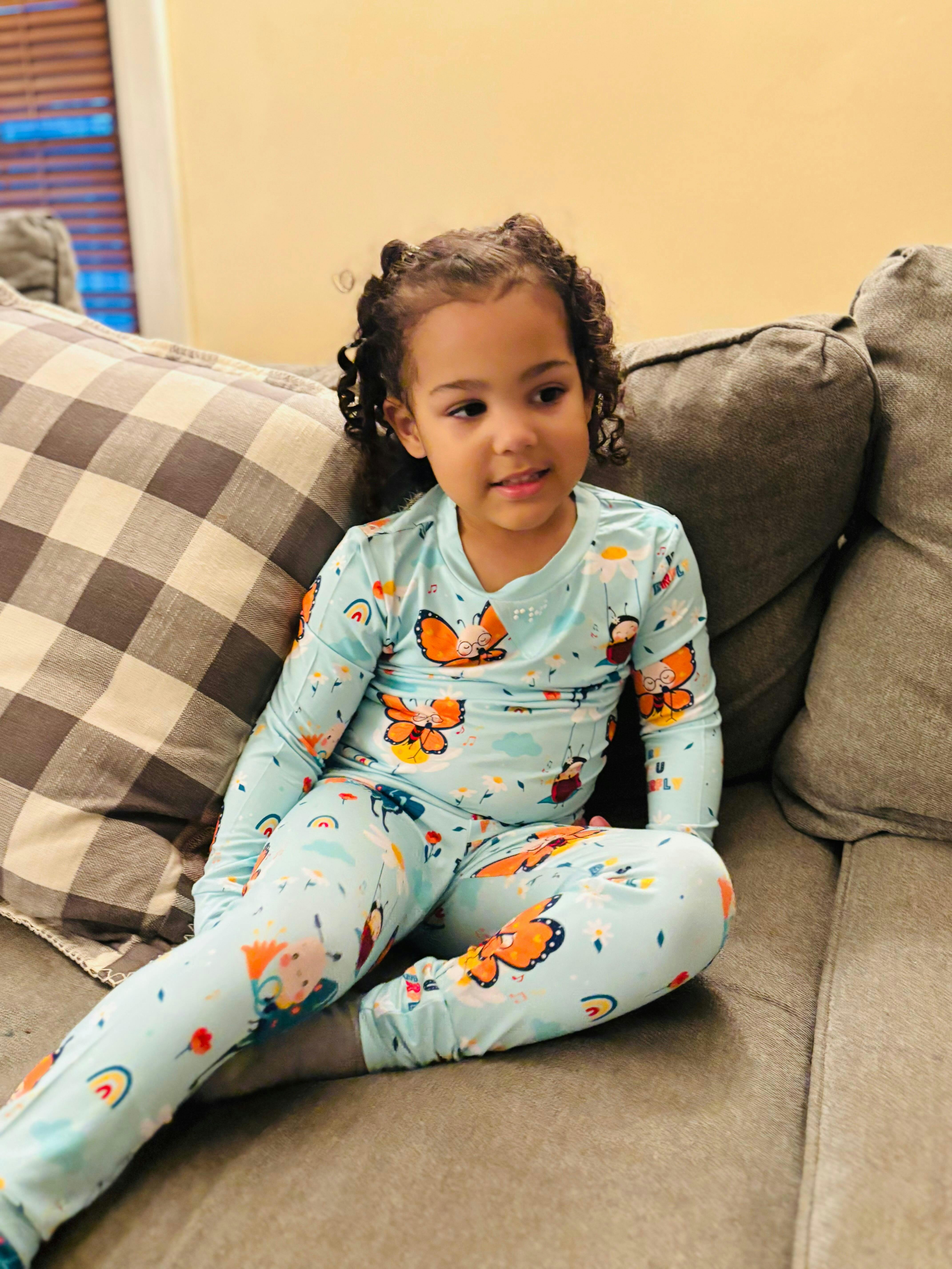 A long-sleeve pajama set featuring a gentle, nature-inspired Bodhi the Butterfly print designed to feel reassuring and familiar at bedtime.